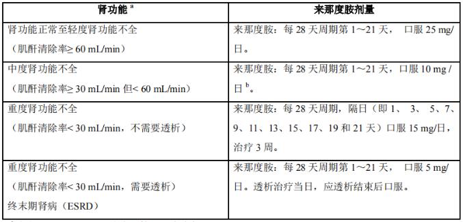 重度肾功能不全患者 (肌酐清除率<30mL/min且不需要透析)的剂量调整:对重度肾功能不全患者(肌酐清除率<30mL/min)的推荐起始剂量为每28天周期的第1~21天中隔日服用来那度胺15mg。如果出现上述3/4级毒性反应,则根据以下步骤下调来那度胺的剂量: