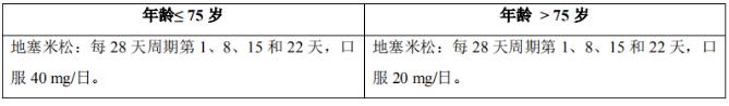 推荐剂量:本品的推荐起始剂量为25mg。在每个重复28天周期里的第1~21天,每日口服本品25mg,直至疾病进展。地塞米松的推荐剂量为在每28天治疗周期的第1、8、15和22天口服40mg地塞米松。处方医生应根据患者的肾功能状况谨慎选择本品的起始剂量和随后的剂量调整(见表 1),应根据患者的年龄选择地塞米松的起始剂量和随后的剂量调整(见表 2)。