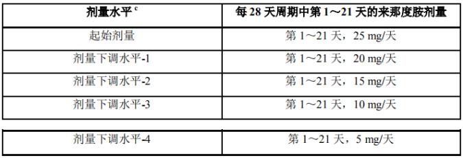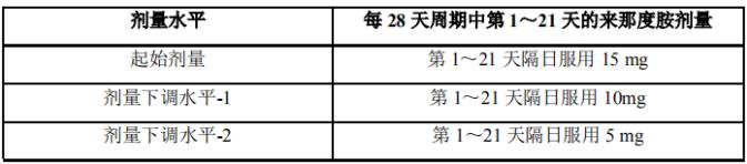 c.应根据来那度胺的起始剂量水平,逐步实施剂量下调步骤。例如,如果起始剂量水平已为15mg,如需降低剂量时应遵循剂量下调步骤至下一剂量水平(即,起始剂量水平为15 mg[剂量下调水平-2],则应降至10 mg [剂量下调水平-3])。