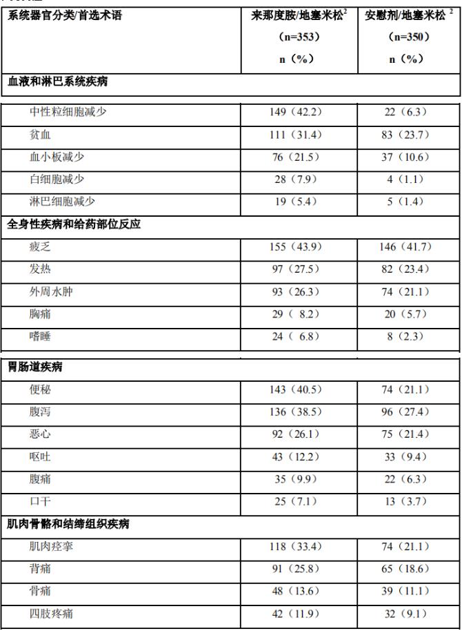 来那度胺/地塞米松组有325名(92%)患者出现了至少一起不良反应,安慰剂/地塞米松组为288名(82%)。