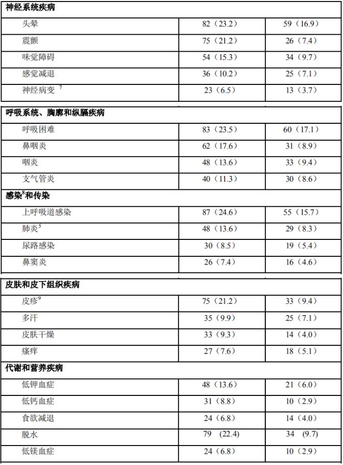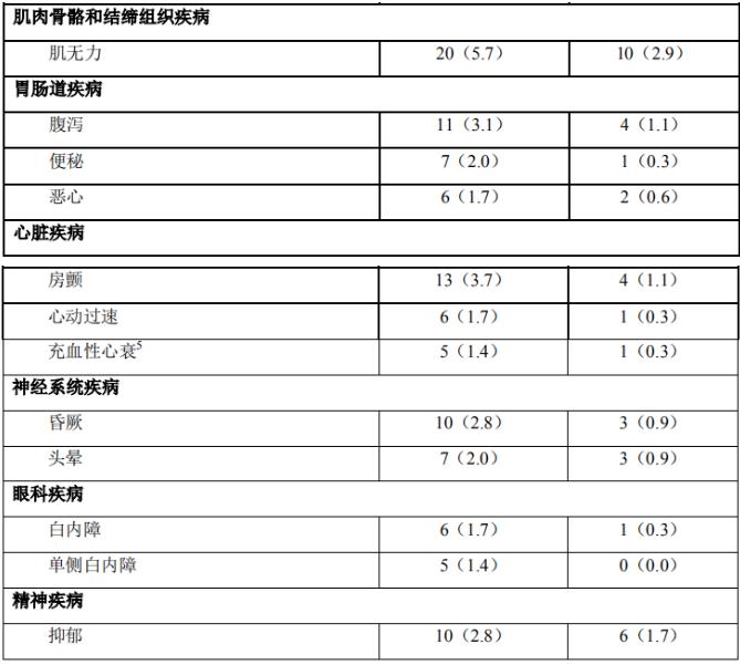 在来那度胺/地塞米松治疗组,有269例(76%)患者发生了至少一次暂停用药,其中有些曾有过剂量下调。与之相比,在安慰剂/地塞米松治疗组,发生这类情况的患者为 199例(57%)。在这些有过一次暂停用药(包括有过剂量下调)的患者中,来那度胺/地塞米松治疗组有50%的患者至少有过一次额外的暂停用药,其中有些曾有过剂量下调。与之相比,安慰剂/地塞米松治疗组中有21%的患者发生过这类情况。与安慰剂/地塞米松治疗组相比,大多数不良事件以及3/4级不良事件在来那度胺/地塞米松组中都发生得更为频繁。表5、6和7总结了来那度胺/地塞米松和安慰剂/地塞米松组中报告的不良反应。