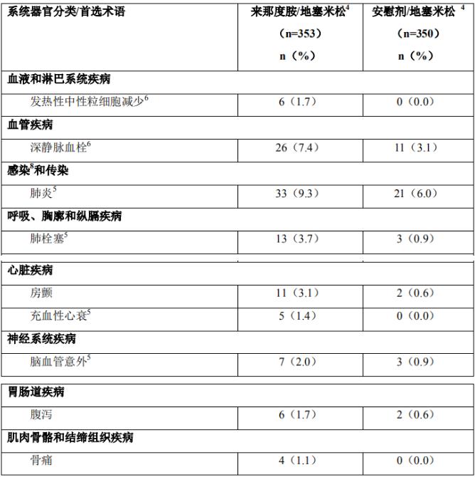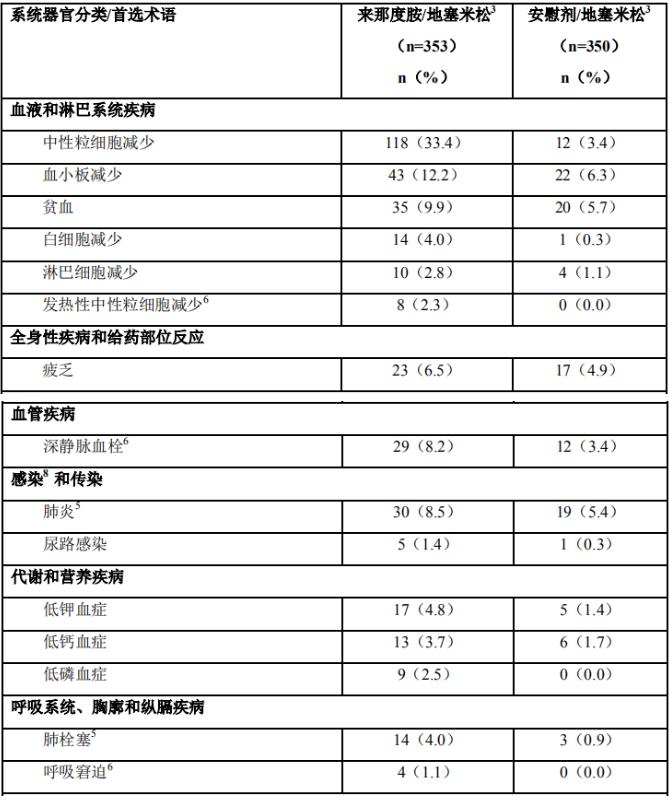 3.来那度胺/地塞米松组发生率≥1%并且两个治疗组之间发生率的差异≥1%的所有治疗中发生的3/4级不良事件(安全性人群)。