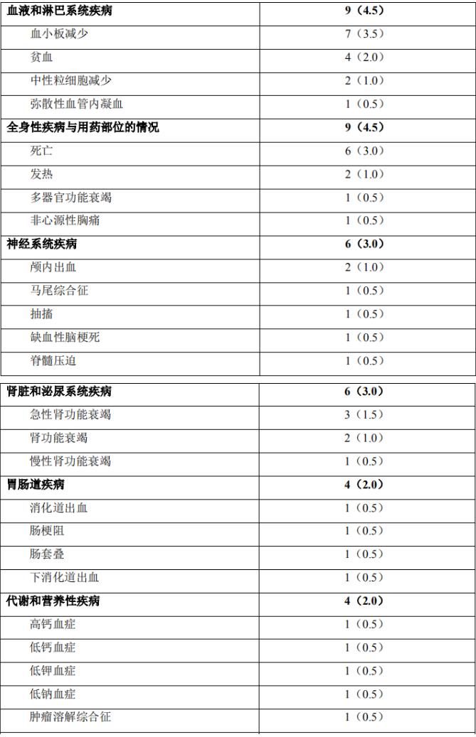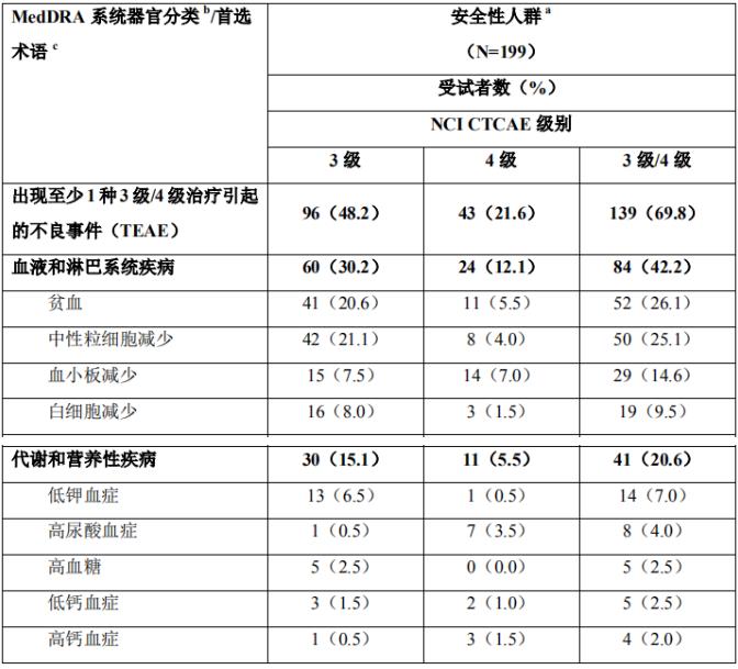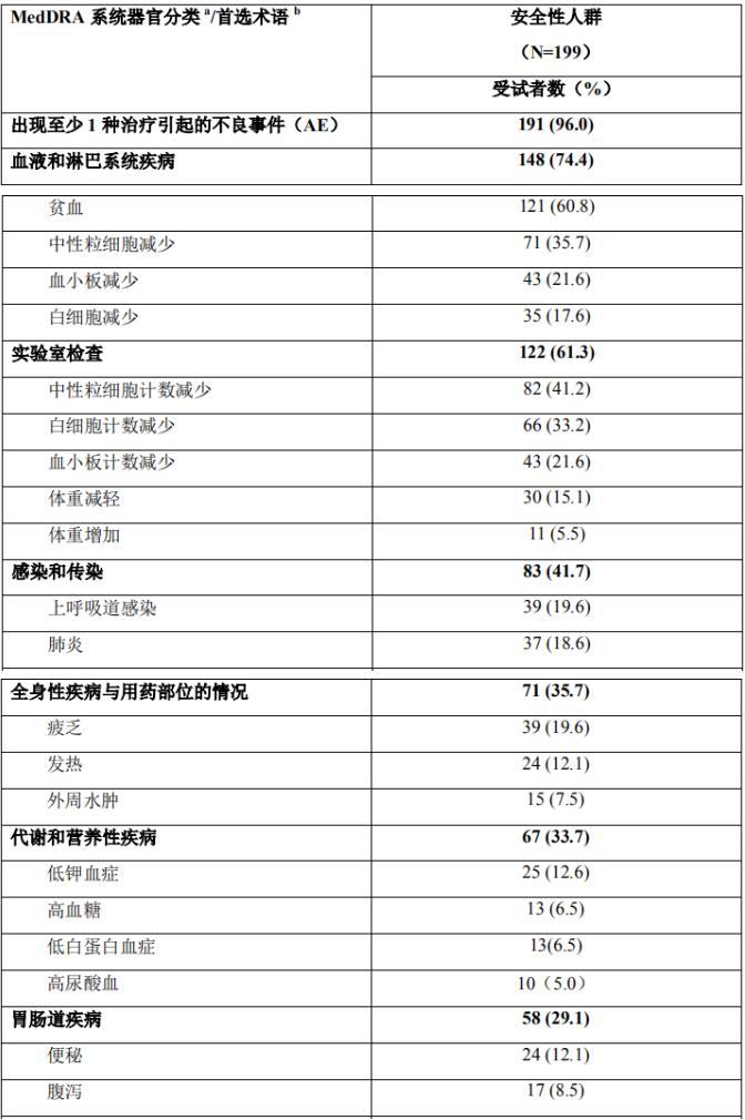 最常见不良事件为贫血(121/199 受试者,60.8%)、中性粒细胞计数减少(82/199 受试者,41.2%)、中性粒细胞减少(71/199 受试者,35.7%)和白细胞计数减少(66/199 受试者,33.2%)。