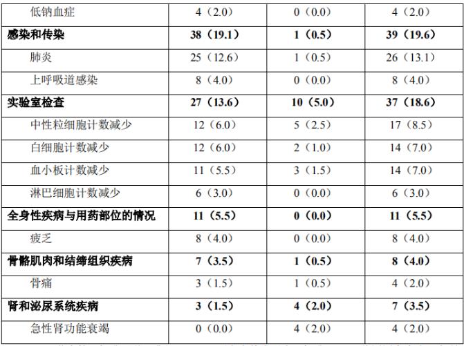 最常见的3级/4级不良事件为贫血(52/199,26.1%)和中性粒细胞减少(50/199,25.1%),其次是血小板减少(29/199,14.6%)、肺炎(26/199,13.1%)、白细胞减少(19/199,9.5%)和中性粒细胞计数减少(17/199,8.5%)。