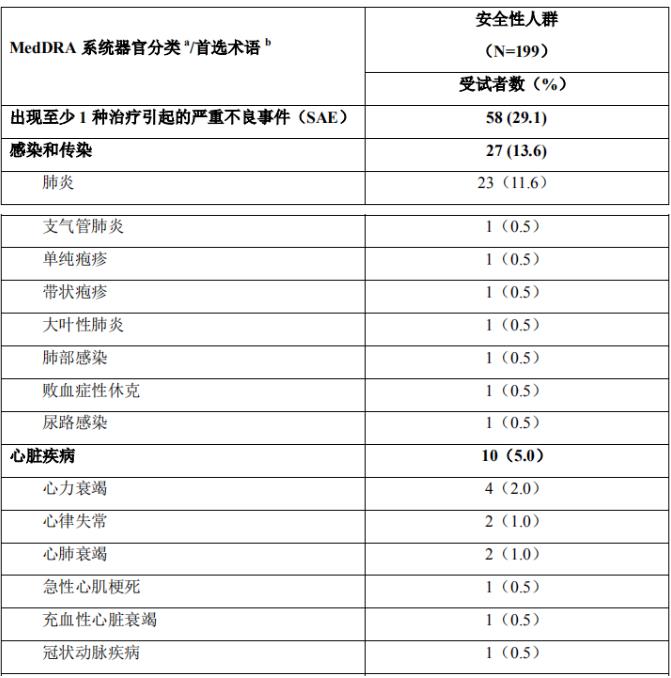 b.按安全性人群各系统器官分类发生严重不良事件频率降序排列。