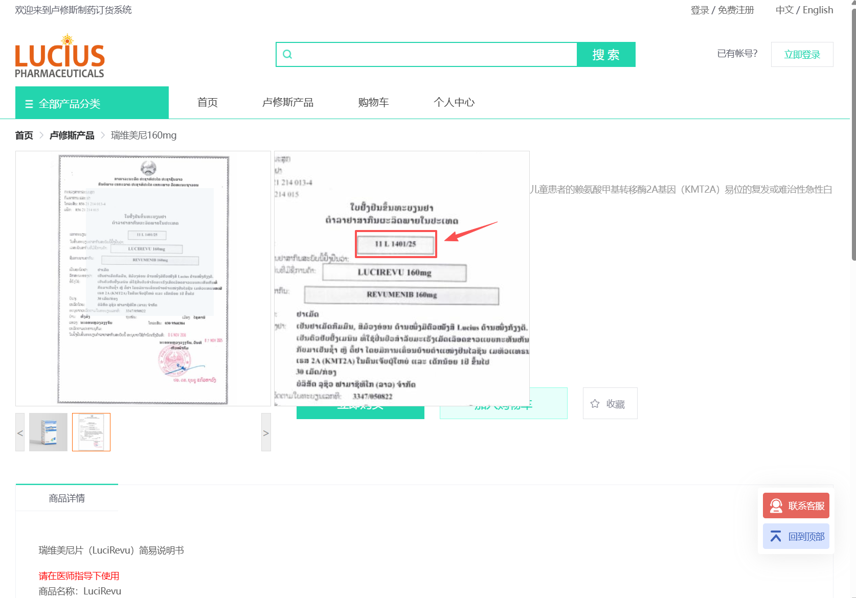 药盒侧面的第一行数字代表了老挝药品卫生部门的批字号,记住这个号码,接下来我们需要打开老挝卢修斯的官网(https://www.lucius.la/)在搜索框找到相对于的产品,对比该产品的外观和批字号是否一致,卢修斯官网有中文和英文两种文字,对于华人来说完全没有压力。
