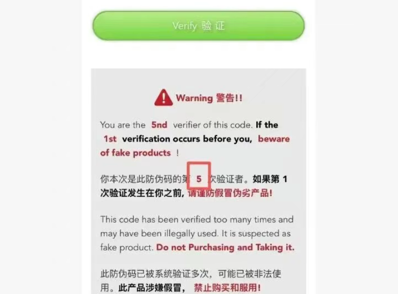 因为验证码多次触发导致系统预警也不用紧张,先在下拉内容中查看一下该防伪码的使用时间和IP,看看是不是前面几次验证的时间和IP地址是不是自己的位置和时间重合,如果不重合,那该产品涉嫌假冒,应立即停止使用。