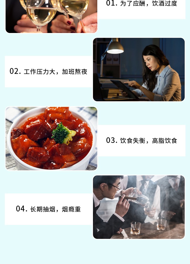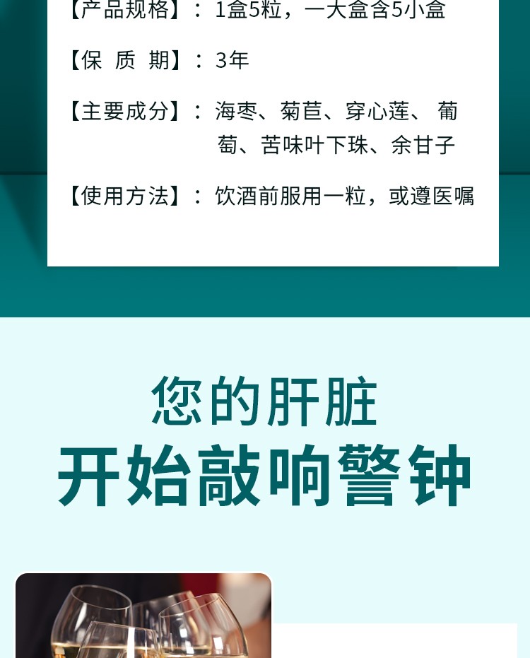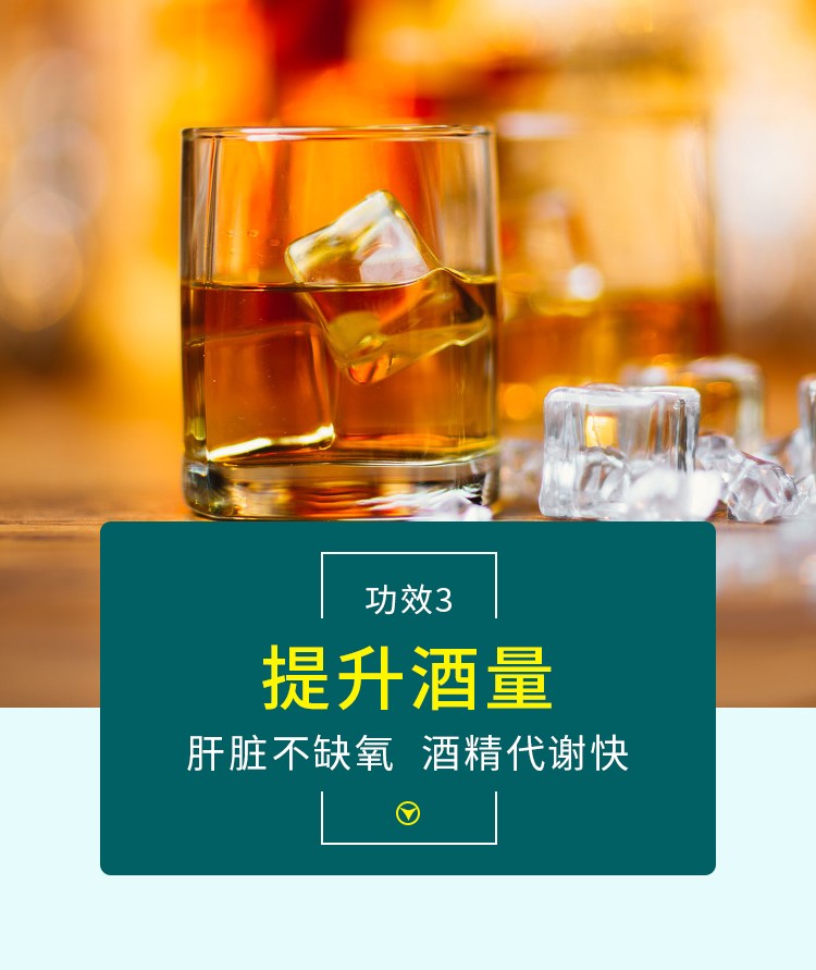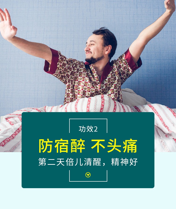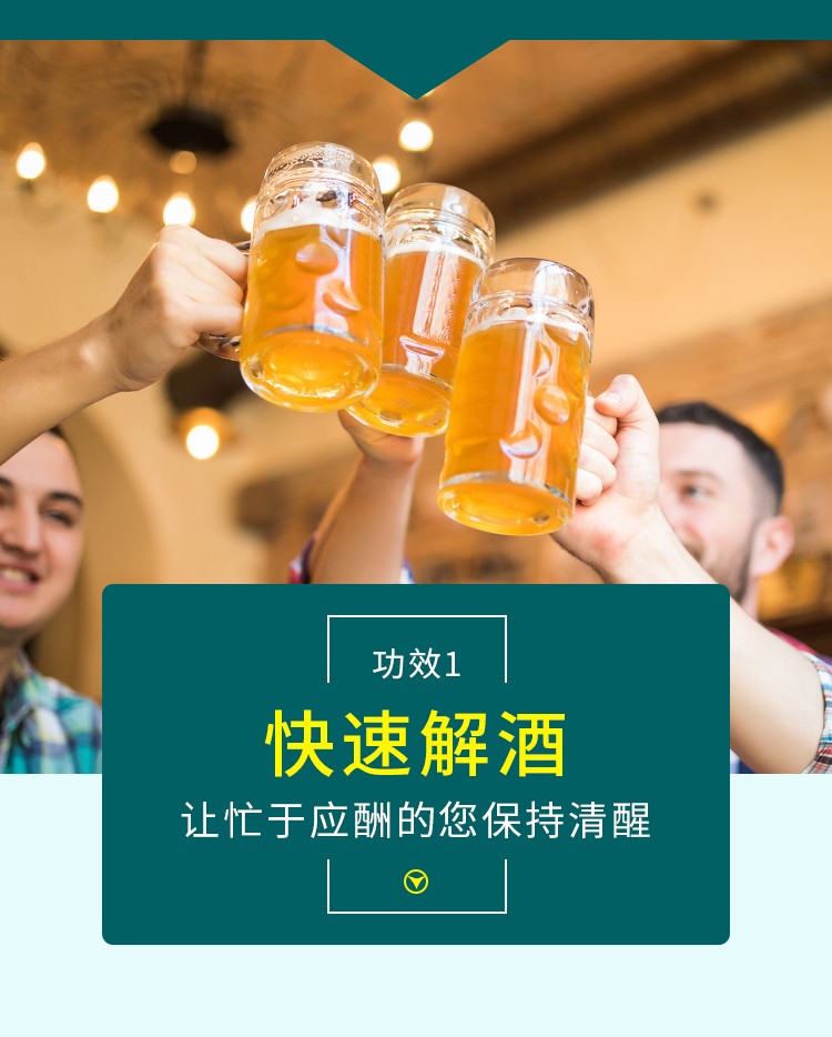 减轻酒精的后遗症:当酒精被消耗时,它主要被肝脏转化为乙醛(酒精代谢的中间代谢产物)。较高浓度的乙醛会导致令人不快的后遗症,如疲劳,头痛,恶心,呕吐,身体疼痛,胃部灼热感和嗜睡。解酒胶囊通过迅速消除血液中的乙醛来预防这些症状。该药通过增加ADH(乙醇脱氢酶)和ALDH(醛脱氢酶)活性来消除乙醛,没有任何副作用。