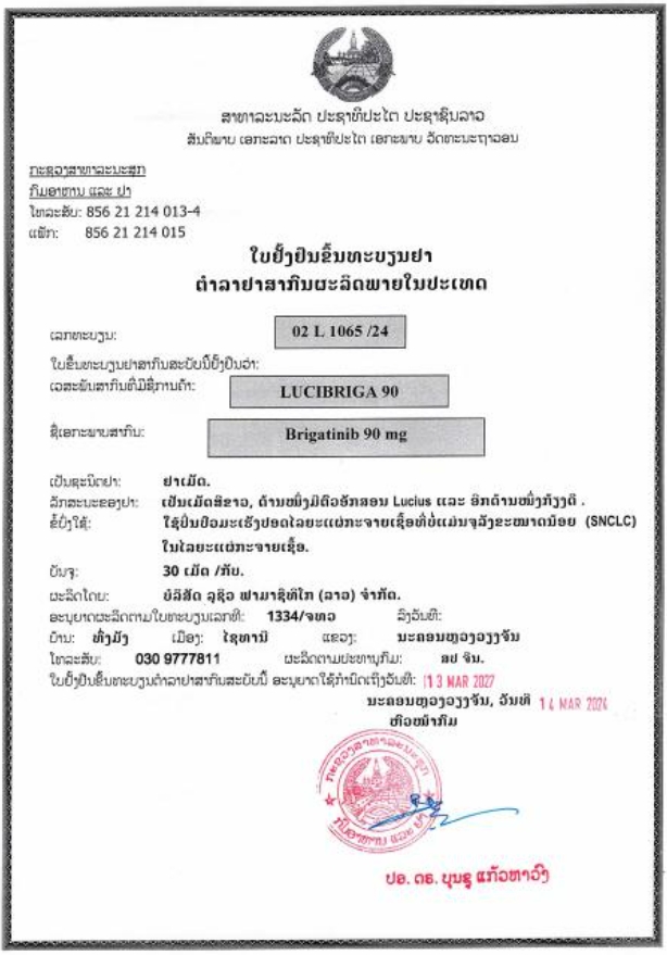 布加替尼90mg老挝药品批准文号:02 L 1065/24