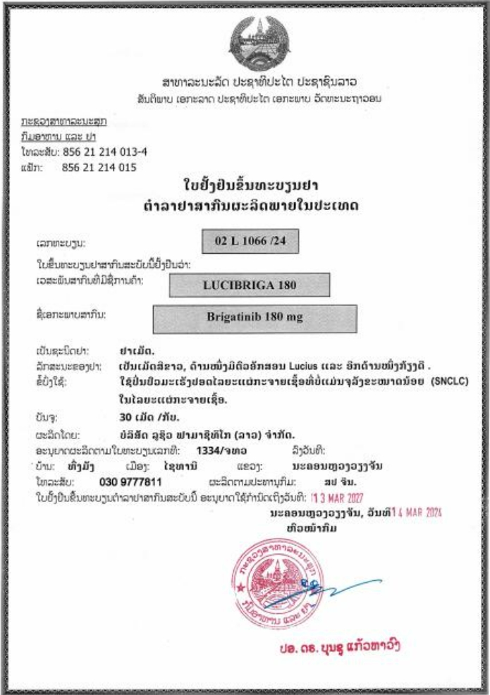 布加替尼180mg老挝药品批准文号:02 L 1066/24