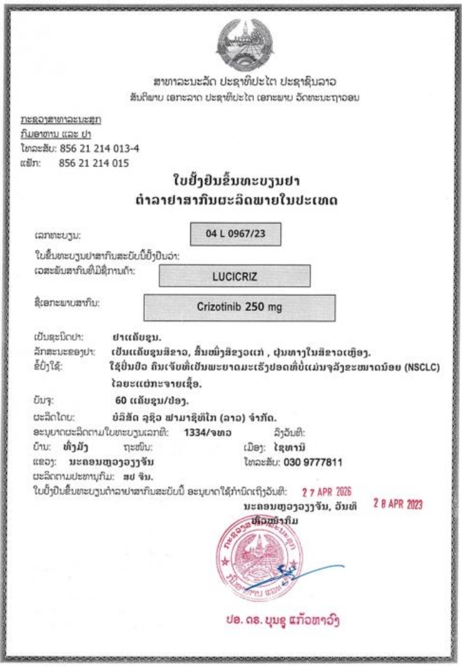 老挝国家药品批准文号:04 L 0967/23