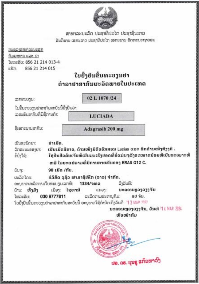 阿达格拉西布是RAS GTPase抑制剂,适用于治疗KRAS G12C突变的局部晚期或转移性非小细胞肺癌癌症(NSCLC)的成年患者,这些患者之前至少接受过一次全身治疗。
