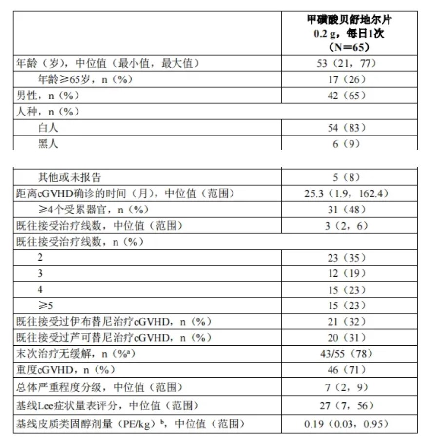 KD025-213(NCT03640481)研究是一项甲磺酸贝舒地尔片治疗既往接受过2-5线系统性治疗且需要额外治疗的cGVHD患者的随机、开放性、多中心研究。该研究排除了以下患者:血小板<50×109/L;中性粒细胞绝对计数<1.5×109/L;AST或ALT>3×ULN;总胆红素>1.5×ULN;QTc(F)>480 ms;eGFR<30 mL/min/1.73 m2;或FEV1≤39%。66例患者接受甲磺酸贝舒地尔片0.2 g每日一次口服治疗。研究允许伴随使用cGVHD支持性治疗。对于GVHD预防治疗和cGVHD标准系统治疗,只要受试者在研究前已接受至少2周的稳定剂量治疗,则允许在研究期间伴随使用。不允许在研究期间开始接受新的cGVHD系统治疗。