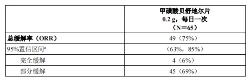 甲磺酸贝舒地尔片的疗效指标是根据2014年NIH缓解标准,基于截至第7周期第1天的总缓解率(ORR),其中,总体缓解包括完全缓解和部分缓解。ORR结果见表5。ORR为75%(95% CI:63,85)。根据首次缓解至进展、死亡或开始新的cGVHD系统性治疗计算的中位缓解持续时间为1.9个月(95% CI:1.2,2.9)。至首次缓解的中位时间为1.8个月(95% CI:1.0,1.9)。在获得缓解的患者中,62%(95% CI:46,74)的患者在缓解后至少12个月内未发生死亡或开始新的系统性治疗。