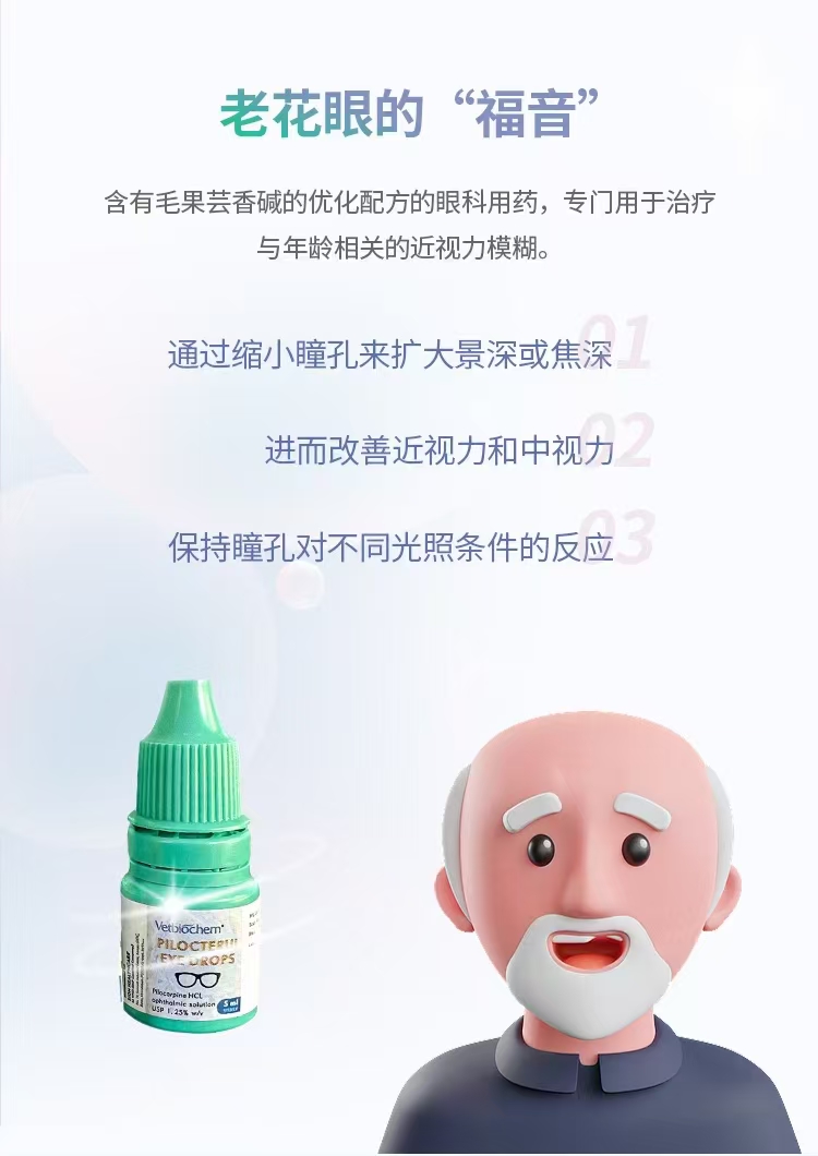 匹罗卡品滴眼液用于治疗成人老花眼,开角型青光眼、闭角型青光眼以及高眼压症。